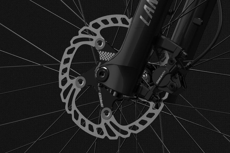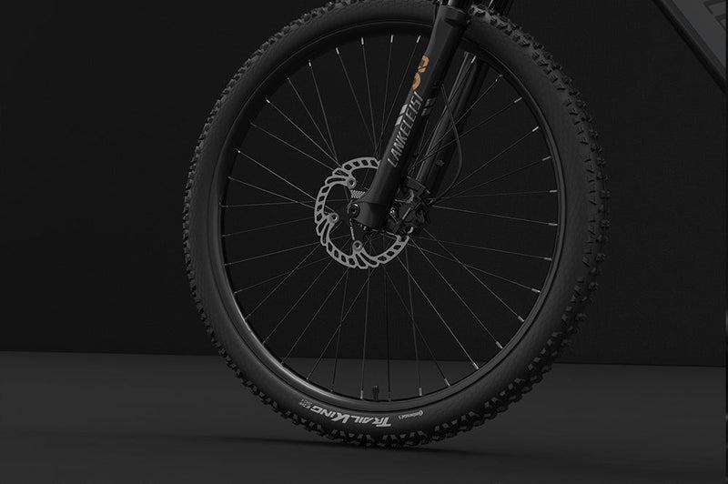 The Lankeleisi GT800 is equipped with a shock suspension system that includes an adjustable front fork with 120mm of travel and an adjustable rear air shock absorber. The front suspension effectively absorbs impacts on rough terrain for better control, while the rear air shock helps reduce rider fatigue, ensuring a more comfortable ride overall.